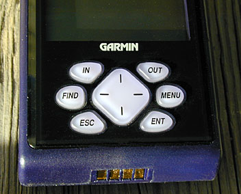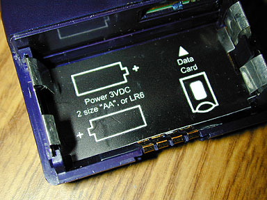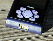 The serial interface connector resides, uncovered, on the front edge just below the control pad. The connector uses a mechanical "slot" arrangement by which the mating connector slides up onto the e-map retained by the slots on either side. The data cable supplied with the "Deluxe" model lacks the 12VDC pin. |