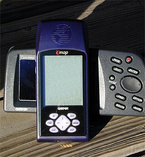 Here's a view of the Garmin e-map as compared to the StreetPilot ColorMap. Surprisingly the screens vary only slightly in size. Yet, the emap is truly a pocket-sized GPS which is a pleasure to carry. The e-map is quite well featured and less confusing for on-the-go automotive use than the III+. While sporting only one route, it does have the same 500 waypoint capacity of newer models. There is no separate compass page, but a compass is provided at the top of the main map screen (may be turned off along with speed, trip distance and time). |