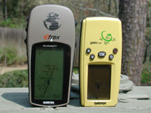 There is also a (green) geko 201 for about $125. The geko is smaller and lighter than an eTrex -using two AAA batteries instead of two AA batteries. The 201 has WAAS and a data-transfer jack. It also has more trackpoints, routes, and waypoint capacity. See (HERE) for a review of the geko 201.