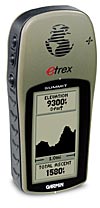 The Garmin eTrex Summit ($210 v. 2.05), check latest prices (HERE), is an upgraded eTrex package with the addition of a built-in electronic compass which shows your receiver heading even when you are not moving. An altitude profiling system will show a profile of your elevation movement along your route of travel. These new features are made possible by a built-in electronic flux-gate compass, and barometric altimeter. The compass is calibrated by the user turning around slowly twice in an interference-free area. The altimeter and GPS altitude are constantly filtered to provide the best measure of altitude. All key controls are on the sides, leaving the front area free for display and antenna.