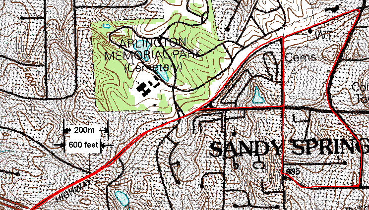 These plots were made by uploading the track (archived with Waypoint+) into a Garmin Street Pilot (with an ETAK map cartridge of the Atlanta area) and to a GlobalMap 100 (with MapCreate) and then downloading screen shots with G7ToWin. The track is made of 'dots' while the streets are made of 'dashes'. It's very hard to tell the tracks from the streets. In many cases they are on top of each other. The track runs along Mt. Vernon Hwy., beside the 'car', and north, east, and west of the 'knife and fork'.
