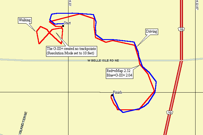 While driving about 5 mph, the G-III+ laid down more trackpoints than the eMap, indicating that the resolution of the eMap is set to something greater than 10 feet.