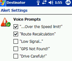 But Destinator will talk to you like the best. There are several "alerts" that you can choose to receive audibly. We did not test this feature. Let's hope their voice features are better implemented than their spelling of "carefully". |
