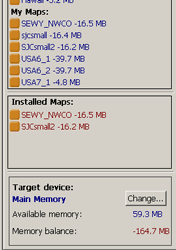 An "estimation" function tells you how much memory your custom map section requires. When you are satisfied, clicking on the "cut" button starts a quick data extraction process that produces a custom data set on your desktop's file system. Back at the map loader, you can select any of your custom datasets, which are easy to get to in a list called "my maps". The list clearly displays the current memory configuration, the size of your selected maps, and the remaining memory. |