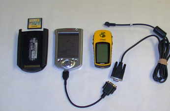 Figure 1- left to right (PocketPC case with compact flash memory card, Pocket PC with cable to serial, Garmin ETrex GPS receiver with download cable)