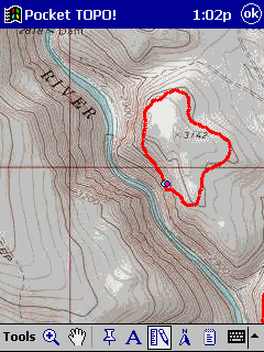 TOPO! Syne USA Software works only with National Geographic’s TOPO! Digital mapping software in both PalmOS and Pocket PC devices (Figure 3 and 3a). Map coverage covers 31 states currently. TOPO! Digital maps cost about $89. per state. A separate piece of software TOPO!GPS ($35) is needed for GPS functionality for use with older TOPO! mapping. Newer products include GPS functionality. Topo Sync USA is used to download the Personal Computer (PC) mapping from Terrain Navigator into a PDA . It cost around $35. TOPO! Works with both PalmOS and PocketPC equipment. It’s features include a "draw" tool to generate an on-screen polygon (Fig.3a). Mapping includes the option of using shaded relief images (Fig. 3).