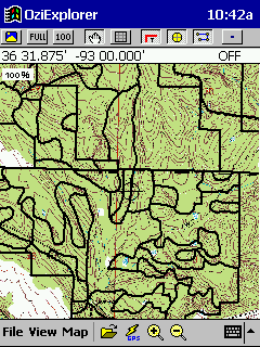 Figure 7 – OziExploreCE screenshot (downloaded –exported view of Bayou Ranger District stand boundary data with DRG background from ArcView).