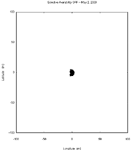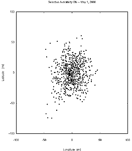 The images compare the accuracy of GPS with and without selective availability (SA). Each plot shows the positional scatter of 6.5 hours of data (0730 to 1400 UTC) taken at one of the Continuously Operating Reference Stations (CORS) operated by the U.S. Coast Guard at Hartsville, Tennessee. On May 2, 2000, SA was no longer present. The plots show that SA causes 95% of the points to fall within a radius of 44.2m. Without SA, 95% of the points fall within a radius of 4.1m.