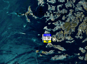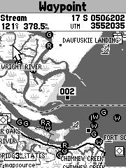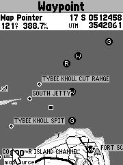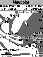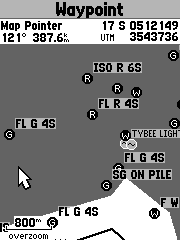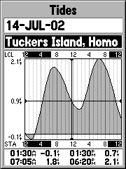 Here the tide table closest to the cursor is calculated by both the GPS unit and OffShore Navigator. As you can see, they are the same. The 'zero' line is Mean Low Level Water. Other units that have tide tables built in are the 152 and 196. The 162 and 168 must download the tide tables from Garmin's site. Although the GPS 76 and GPS 72 also contain tide-prediction tables, they cannot accept BlueCharts.