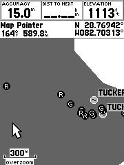 First across the top of the screen you get three fixed data fields. Left to right, speed, elevation and accuracy. Next line down give you status, Like 2D GPS location, 3D GPS location, 2D Differential, 3D Differential, Simulating GPS. Below this you get the usual sky view of satellites and signal strength. The sky view is on the left the signal strength is on two lines to the right. The next line below this had the date and time as set in the setup menu. And finally at the bottom in nice large font is your location in the format you have specified in the setup menu. One thing to note here is that there is no longer a DOP (dilution of precision) measurement. We liked that on the G-III+.
