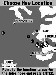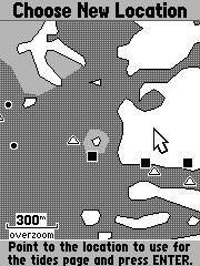 In order to use the map and cursor to find a tide station, you must highlight the NAME field for the tide station that is displayed. Then arrow down to the last entry (or if you're clever, just arrow up once!) which should be Use Map and hit enter. You will then see a map of the US load (painfully slowly I might add). Zoom in and pan to the location you are interested in and hit ENTER, or if you want your present location, just hit enter immediately. You should then get a list of the nearest tide stations (sorted by proximity) to the position the cursor was at the time you hit enter. Select the correct one and hit ENTER again, and you should have it.